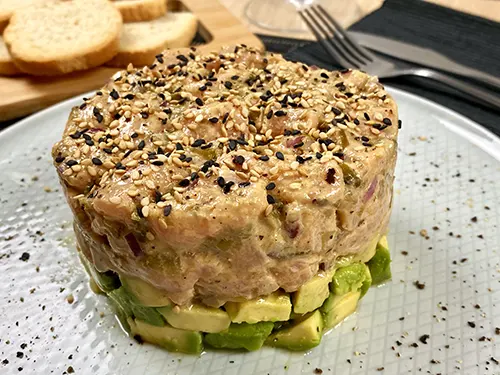 Step 2: Then, on a plate and with the help of a round mold, add the avocado until it covers the bottom, then add the salmon mixture, carefully remove the mold, add a little more pepper and sesame seeds on top, and your delicious salmon tartare is ready.